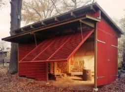 Warto zaczerpnąć z tych wzorów przy projektowaniu drewutni. Drewutnie amerykańskie, Firewood Shed Nie wiem kto zaczął, wiem dlaczego, tak najkrócej można zakotwiczyć historię amerykańskich drewutni. Mieszanina narodowości i co za tym idzie tradycji, kumulacja energii, pomysłowości ludzi zdanych tylko na siebie, ale czujących, że są na swoim, obrodziła wieloma wzorami drewutni. Powszechnie dostępne drewno, a przy tym tanie paliwo, wymagało przygotowania i odpowiedniego zabezpieczenia na surowe zimy. Bez tego nie dałoby się przeżyć. Z wielu pomysłów niektóre bardziej wpadały w oko, były bardziej praktyczne i z czasem zaczęto je powtarzać. W odróżnieniu od fińskich amerykańskie drewutnie są znacznie szersze. Te starsze wzory najlepiej obrazuje poniższa makieta.